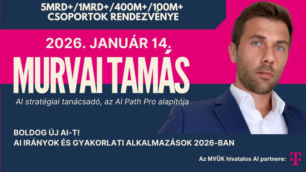 Murvai Tamás szerint 2026. az az év, amikor a mesterséges intelligencia már nem „jó ha van”, hanem alapüzemi elemmé válik minden modern vállalatnál.  Az AI Path Pro alapítójával  már találkozhattatok az MVÜK színpadon. Szakmai ismeretei, rendszerező megközelítése és lebilincselő stílusa egyszerre garancia arra, hogy a legforróbb témákat és a legjobb feldolgozásban hozza el az évnyitó találkozónkra.  Előadásának fókuszában azok az AI-megoldásokat állnak, amelyeket minden cégnek használnia kell 2026-ban, és az, hogy milyen változásokra érdemes felkészülni ebben az évben.